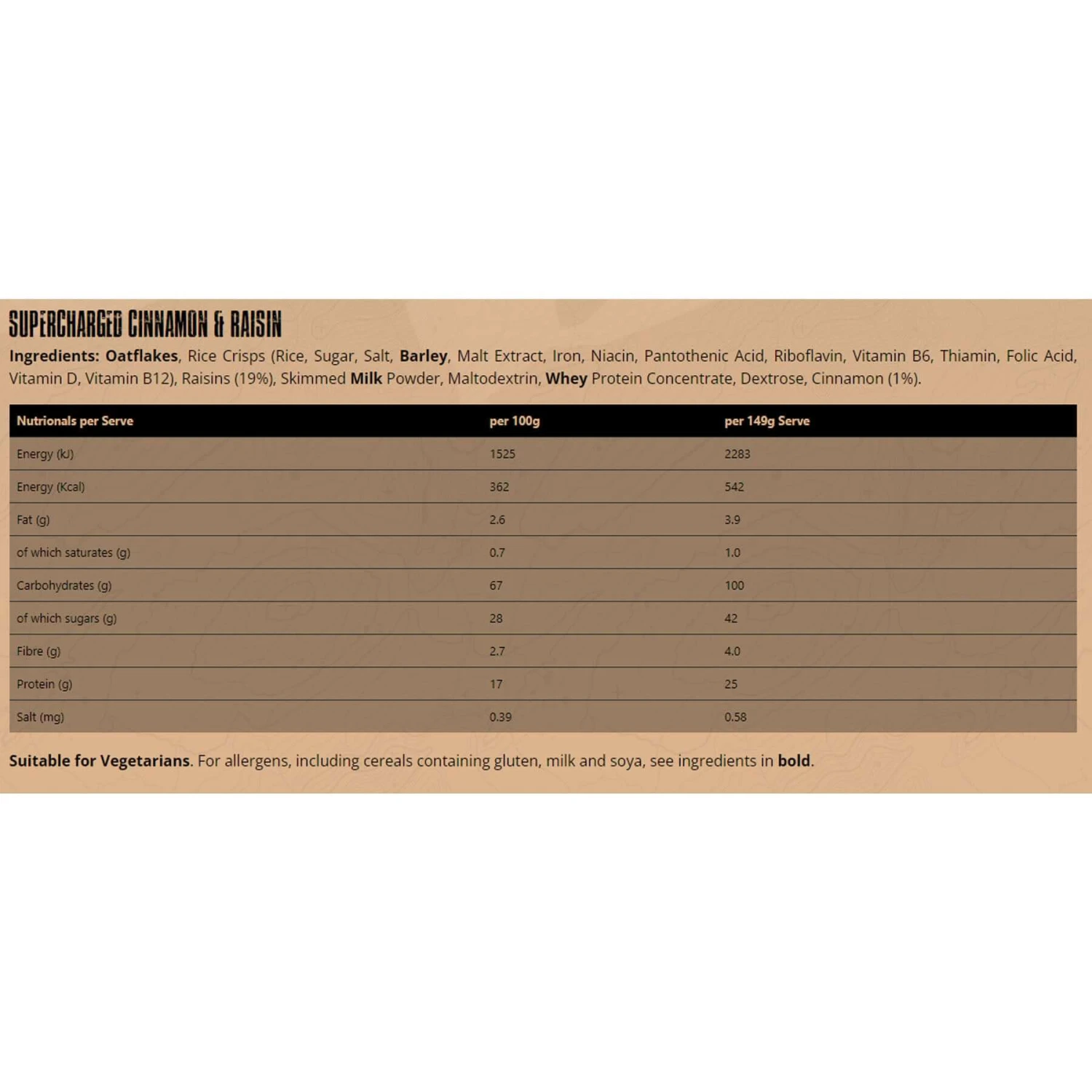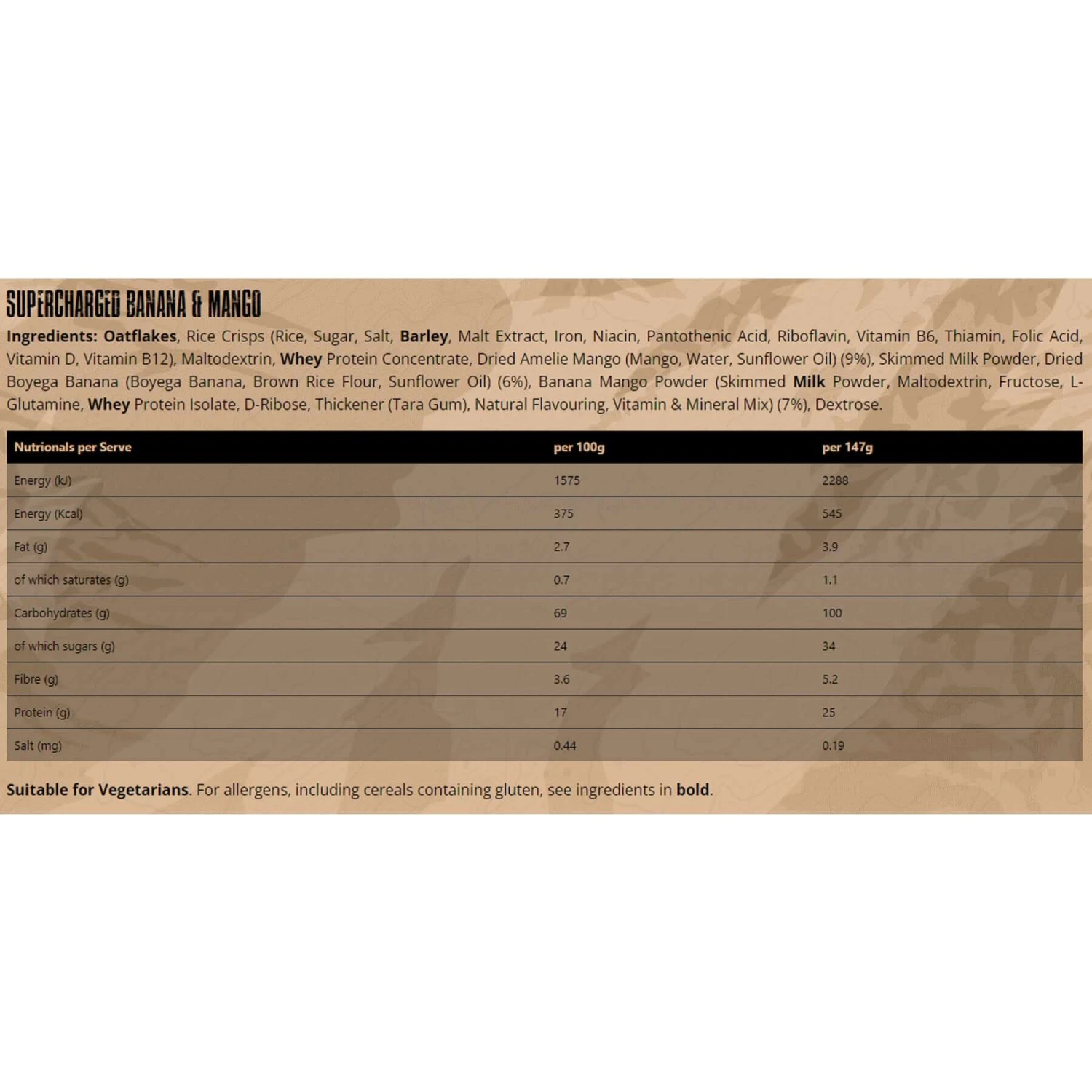 A very high energy instant breakfast containing 25 grams of high quality vegetarian protein and 100 grams of carbohydrate. Just add hot or cold water. Over 500 useful calories.